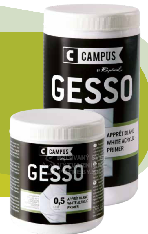 Akrylová farba abstract Gesso je biela, rýchloschnúca a dobre kryjúca farba, ktorá sa používa ako základný náter alebo na lepšiu priľnavosť farieb na povrchy ako drevo, plátno atď.
