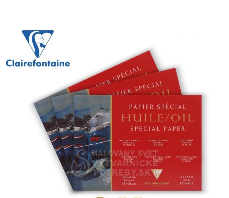 Špeciálne papierové bloky Clairefontaine Oil obsahujú 15 listov papiera s hmotnosťou 240 g/ m2, ktoré sú ideálne pre olejomaľbu. Papier má stredne jemnú ľanovú štruktúru.