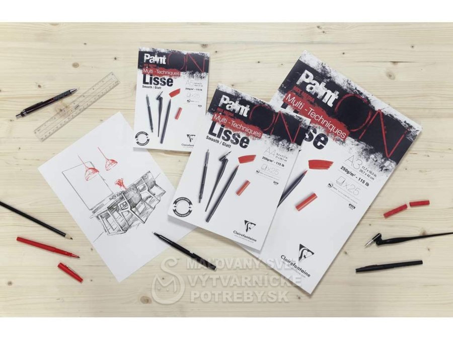 Blok Clairefontaine Paint on Smooth má extra biely hladký papier zo 100% celulózy. Hladký povrch je ideálny pre technické a presné výkresy. Papier je vhodný pre suché aj mokré techniky, má dobré absorbčné schopnosti. Ideálny pre ilustračné kresby.