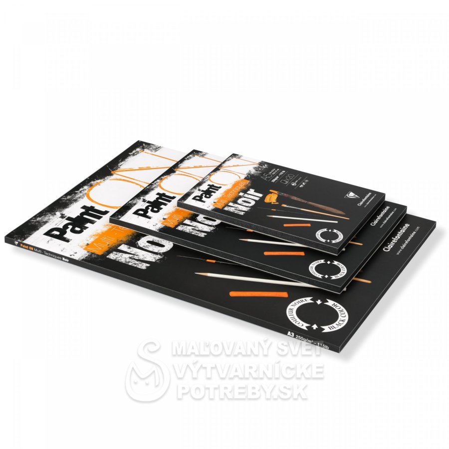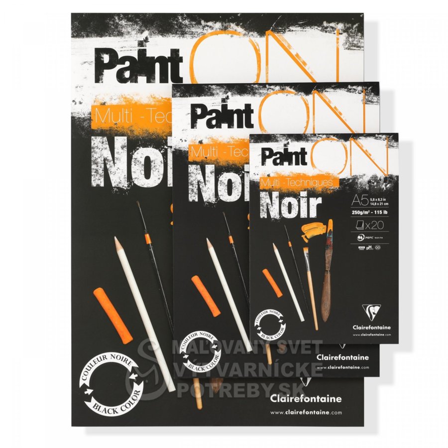 Blok zo série Paint ON Noir od Clairefontaine , obsahujúci 20 listov hrubého čierneho papiera bez obsahu kyselín .