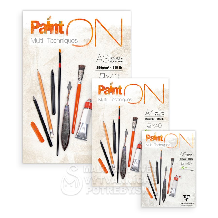 Clairefontaine Paint'On Multi Technique obsahuje 40 listov extra bieleho papiera s hmotnosťou 250 g/m2, ktorý je nalepený na jednom konci. Papier je zo 100% celulózy, má veľmi ľahkú zrnitosť a je ideálny pre multimediálne techniky.