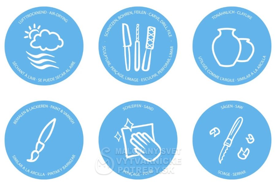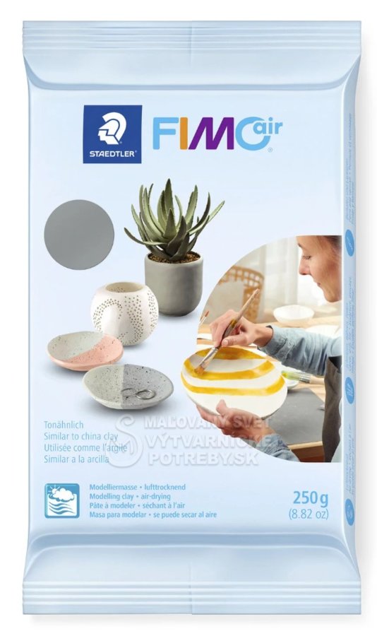 STAEDTLER FIMOair je na vzduchu schnúca modelovacia hmota. Doba schnutia závisí od hrúbky modelovaného predmetu. To znamená, že vymodelované predmety nemusíte vytvrdzovať v rúre. Navyše, po uschnutí budú vaše veci stále extrémne odolné proti rozbitiu. S dokončovaním kúskov môžete začať hneď, ako uschnú. FIMOair je k dispozícii v štyroch variantoch, ktoré sú ideálne na vytváranie radu rôznych predmetov: FIMOair, FIMOair light, FIMOair s granitovým efektom a FIMOair s dreveným efektom.
