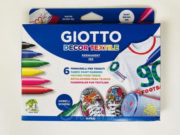 Súprava špeciálnych popisovačov na textil s atramentom na vodnej báze. Farba rýchlo zasychá. Tenký hrot je možné využiť na zdobenie väčšiny svetlých látok. Súprava 6 farieb (čierna, modrá, zelená, červená, neonová žltá a neonová ružová)