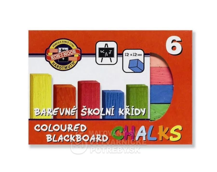Sada 6 kusov štvorcovej farebnej kriedy 12 x 12 x 100 mm, určená na písanie na tabuľu, vložená do škatule s potlačou.