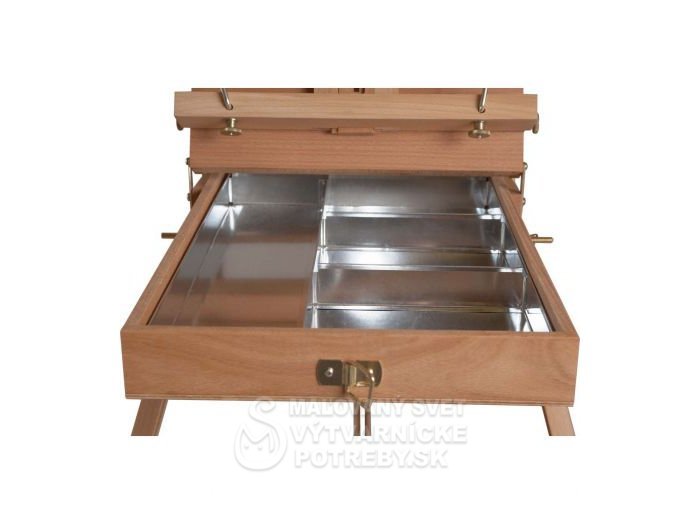 Veľkou výhodou oproti klasickým poľným stojanom je jeho odkladací kufrík na farby a ostatné pomôcky na maľovanie, ktorý obsahuje už v základe maliarsku paletu.
