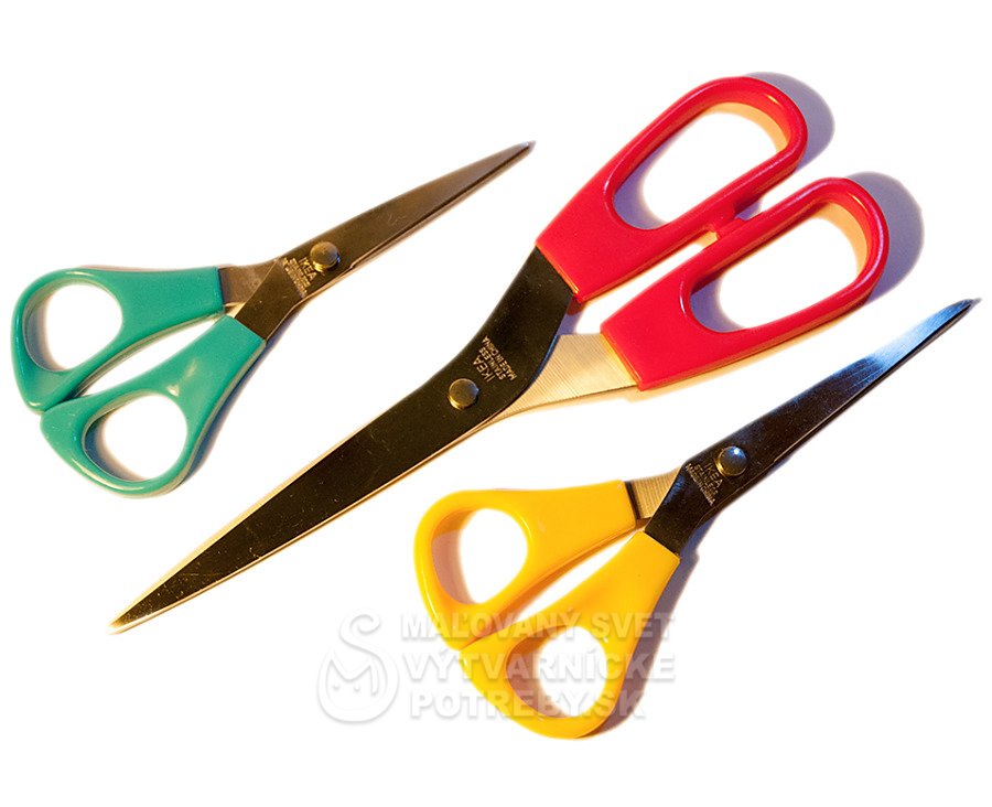 Trojdielna sada kovových nožníc s plastovou rúčkou, dĺžka ostria cca 9, 6 a 5 cm.