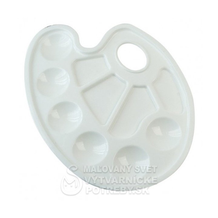 Plastová paleta je ideálna na nanášanie rôznych druhov farieb, má oválny tvar a pozostáva z 10jamiek na vytlačenie a miešanie farieb a médií.