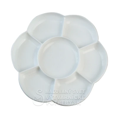 Paleta plastová v tvare kvetinky so šiestimi malými jamkami a v strede jednu väčšiu.Paleta má priemer 17 cm .