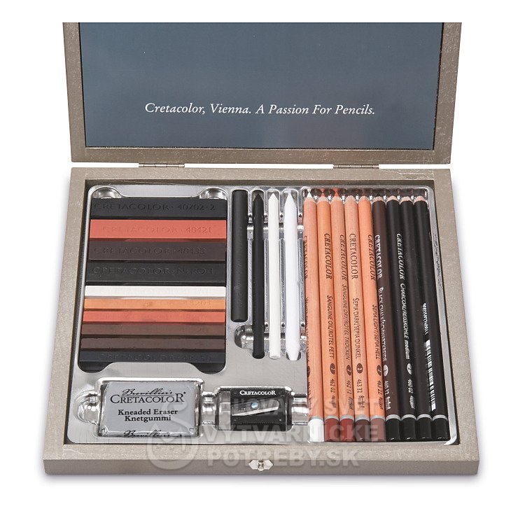 CRETACOLOR Passion box v drevenej kazete je populárna sada pre kresbu uhlíkom. Obsahuje všetky dôležité uhlové produkty vrátane grafitu Monolith pre skicu a kresbu. Obsahuje 20ks: mäkká, stredná a tvrdá uhlová ceruza, mäkká, stredná, extra tvrdá ceruza Nero, hranol Monolith 6B, 9B, 5 ks. lisovaný uhík mäkký, stredný a tvrdý, prírodný uhlík 4mm a 6mm, plastická guma, papierová tyčinka na rozotieranie. Dodávané v čiernom lakovanom obale, vhodné ako darčeková sada.
