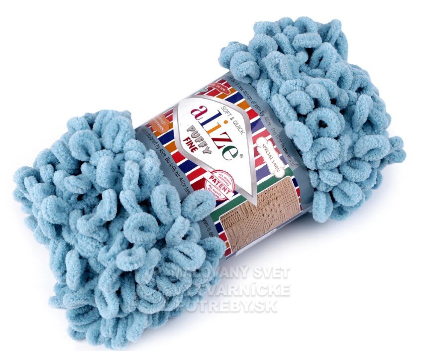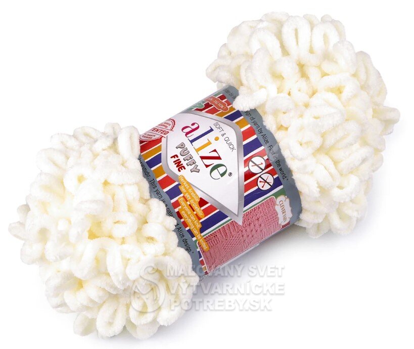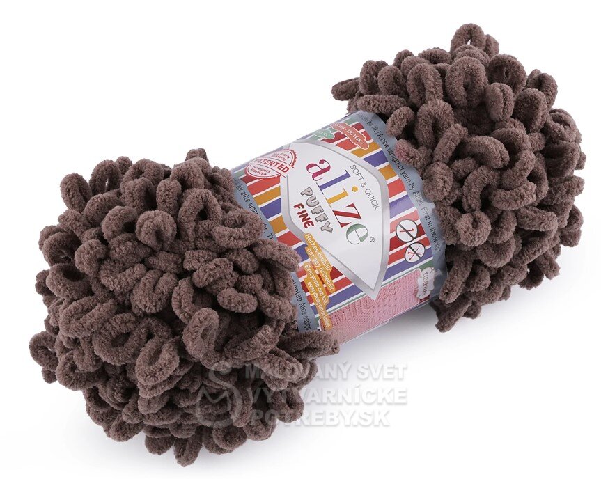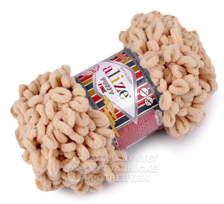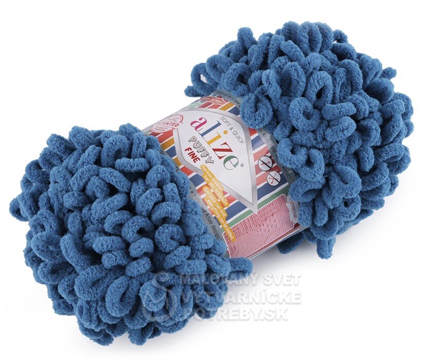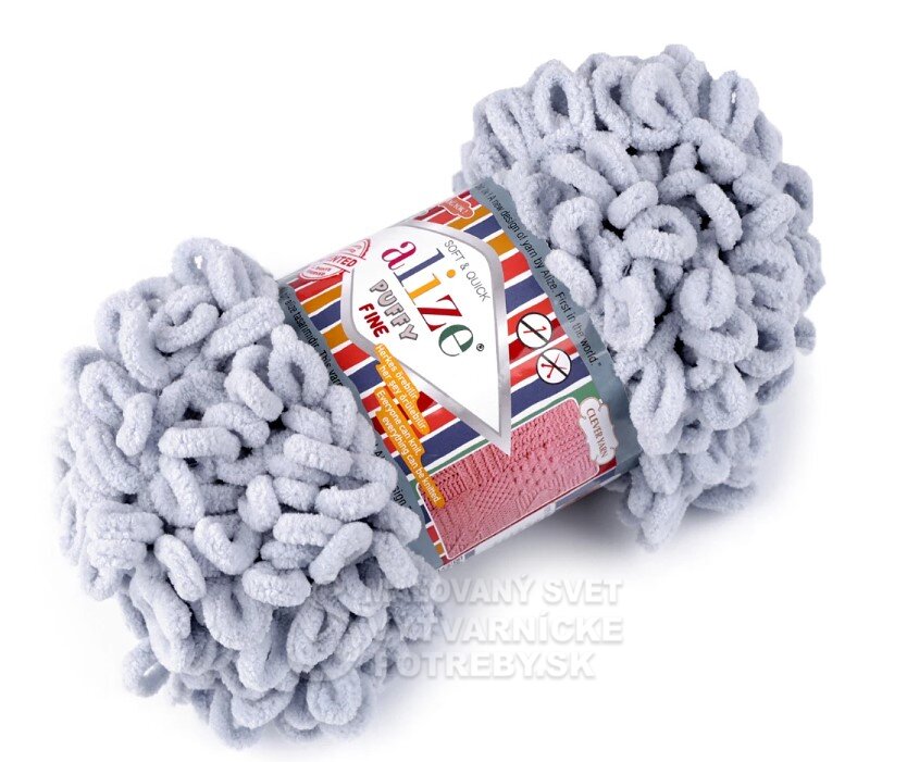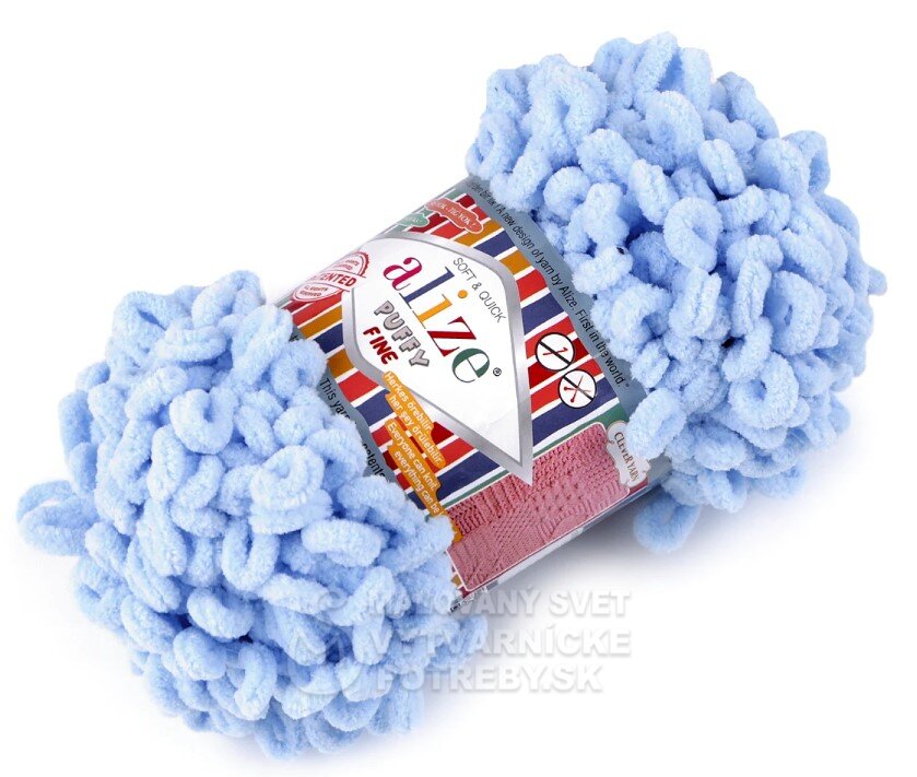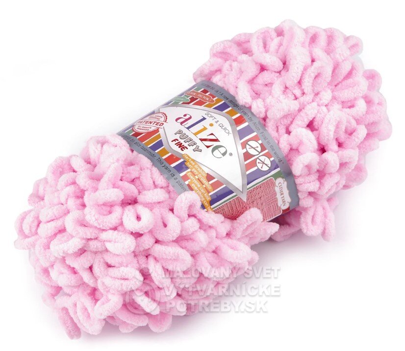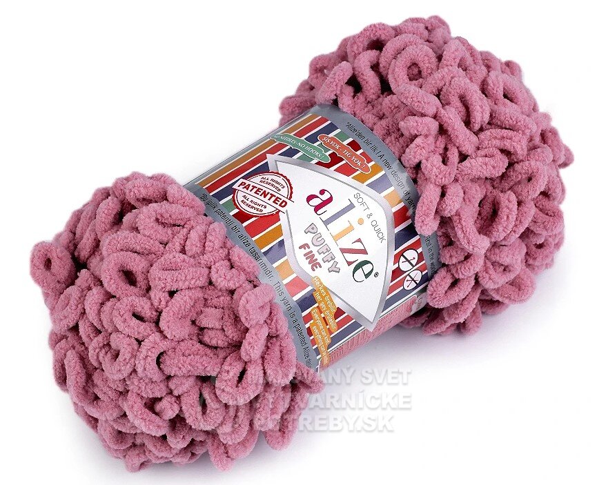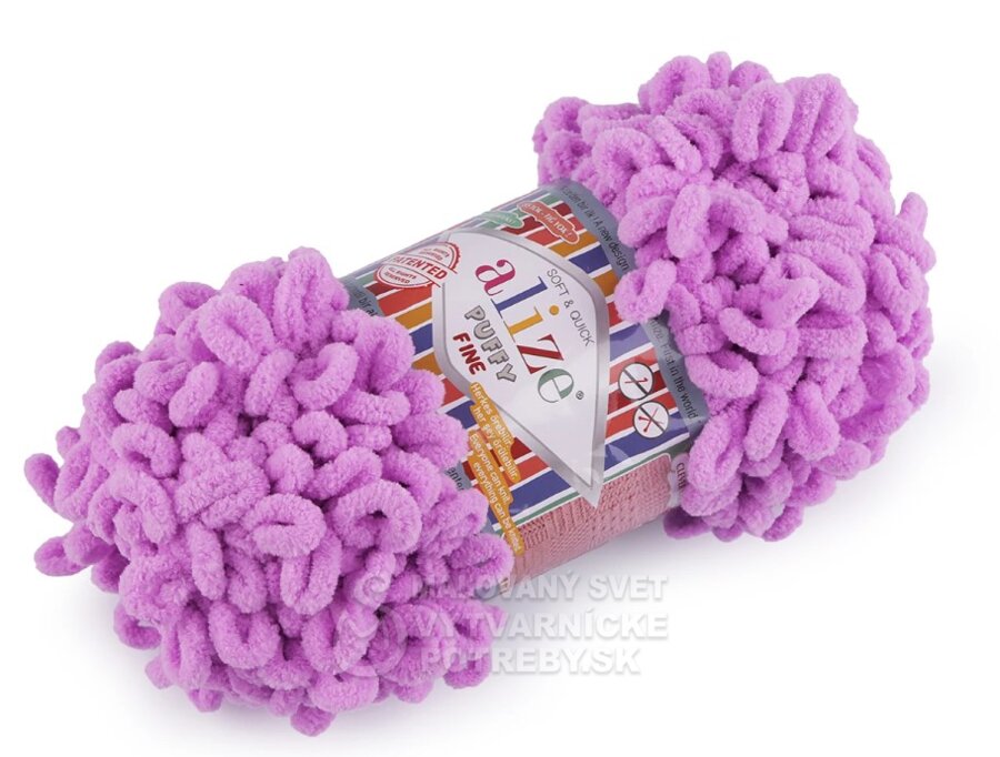 Priadza Alize Puffy Fine je mäkká, chlpatá ženilková priadza s veľkými očkami. Na pletenie nepotrebujete ihlice ani háčik - preplietajú sa jednotlivé očká. Je vhodná na pletenie diek, šálov a pod.