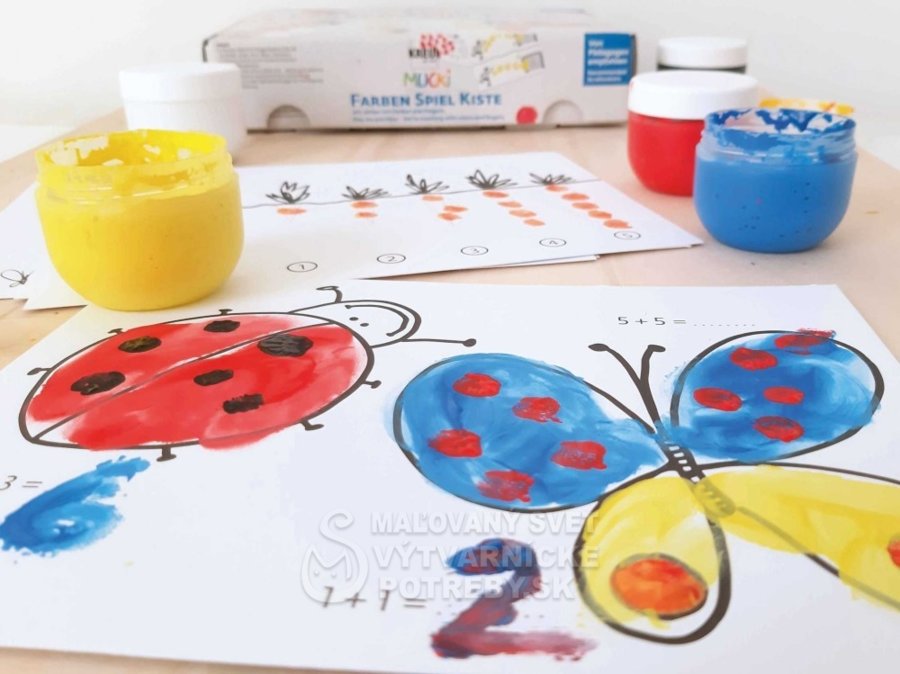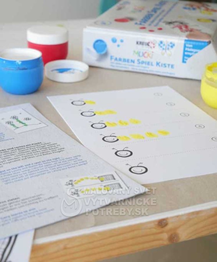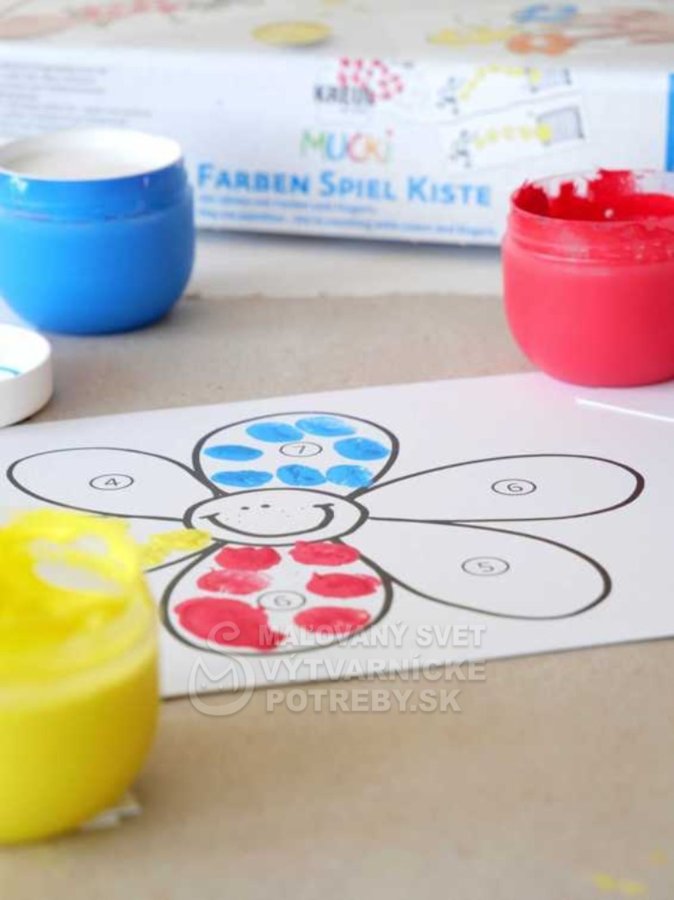 S krabičkami od MUCKI Play me, ktoré sú zábavné a zároveň poučné, deti spoznajú svet farieb. Táto sada pomáha svojmu dieťaťu naučiť sa počítať a odhadovať proporcie. Deti spoznávajú farby a čísla spoločne s dospelým. Ilustrované pokyny v našej brožúre vás prevedú svetom farieb krok za krokom. Deti od 4 rokov chcú a mali by byť povzbudzované, aby si veci vyskúšali samy. Hra s farbami trénuje zmyslové vnímanie, jemnú motoriku, matematicko-logické zmýšľanie a koordináciu oko-ruka, vďaka čomu sú hravo pripravení na písanie v škole. Farby na vodnej báze majú krémovú konzistenciu pre ľahkú aplikáciu prstami. Možno ich vyprať z odevov pri teplote nad 30 °C. Dermatologicky testované. Výrobok nie je vhodný pre deti do 3 rokov. Balenie obsahuje 5 prstových farieb po 50 ml (biela, žltá, červená, modrá, čierna), 2 malé tégliky na miešanie farieb a skladovanie, 14 kartičiek s motívmi QR kód pre získanie ďalších motívov, návod na hru.