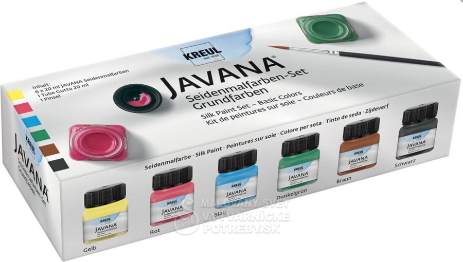 • 6 x 20 ml JAVANA farba na hodváb – žltá, červená, modrá, tmavo zelená, hnedá a čierna