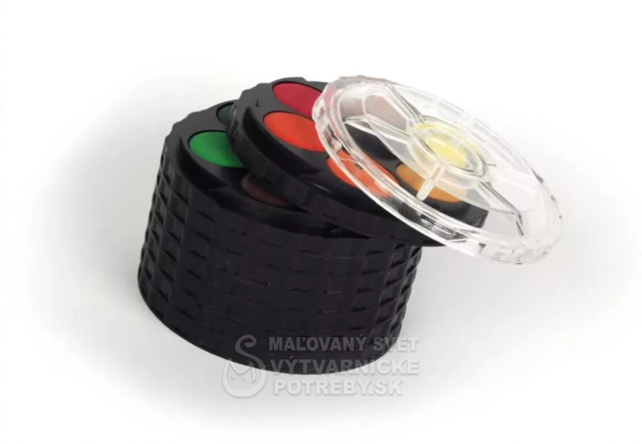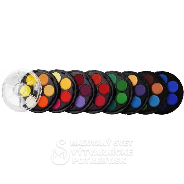 Školské akvarely v 48 farebných odtieňoch a tablety s priemerom 22,5 mm v okrúhlych plastových jednopodlažných farebných podložkách. Farebné odtiene sú výrazné a vyznačujú sa veľkým objemom pigmentu.
