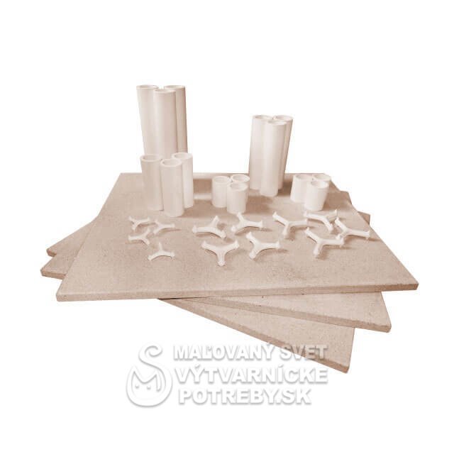Počet dosiek | Rozmery dosiek (mm) | Počet stojek (50 mm) | Pošet stojek (100 mm ) | Počet stojek ( 150 mm ) | Počet stojek ( 200 mm ) | Sada keramických trojnožiek | Kaolin (1 kg ) | Kordieritové doštičky pre njnižšiu zakladaciu vrstvu | Celková hmotnosť ( kg ) |